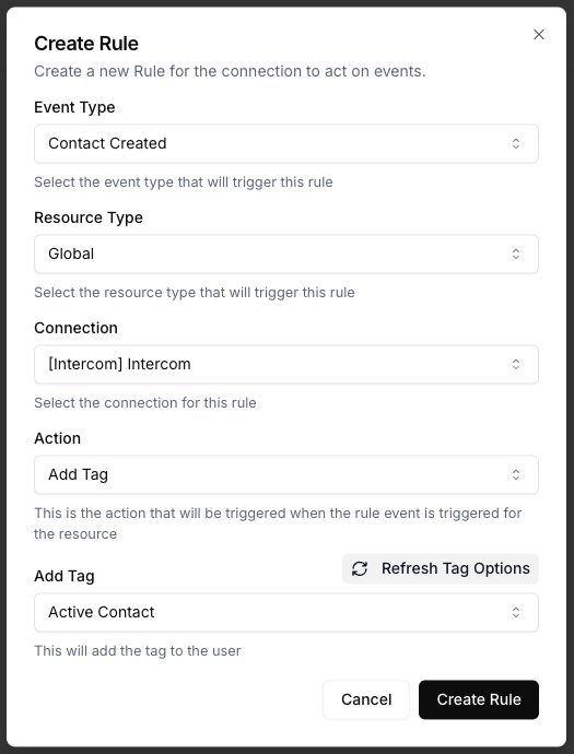 Once the Intercom connection is created, you can define rules that determine how tags are applied to contacts in Intercom.