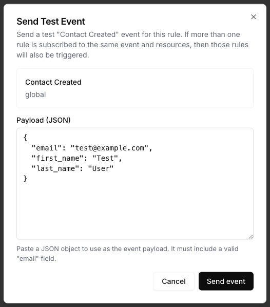Meshes allows you to test rules or run one-off integrations using the Send Test Event feature.